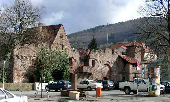 Das ehemalige Schloss, heute Rathaus und Sitz der Stadtverwaltung, setzt sich aus Bauteilen verschiedener Epochen zusammen. Zum ältesten Baubestand aus der Zeit um 1400 gehört die Durchfahrt des Obertorturms, der durch den Umbau Ende des 17. Jahrhunderts seinen wehrhaften Charakter verlor. Nördlich schließt sich der Renaissancebau des Kurpfälzischen Schlosses von 1537 an. Hier verbrachten Mitglieder der kurfürstlichen Familie wie Ottheinrich, Johann Wilhelm und seine Frau Anna Maria Luisa Medici sowie Elisabeth Auguste längere Zeit. Dann folgt der von der Familie Berckheim in der zweiten Hälfte des 19. Jahrhunderts umgebaute Schlossteil mit dem 1868 errichteten neugotischen Turm. Der südlich des Obertors gelegene barocke Schlossteil wurde 1725 durch die Familie Ulner von Dieburg errichtet.