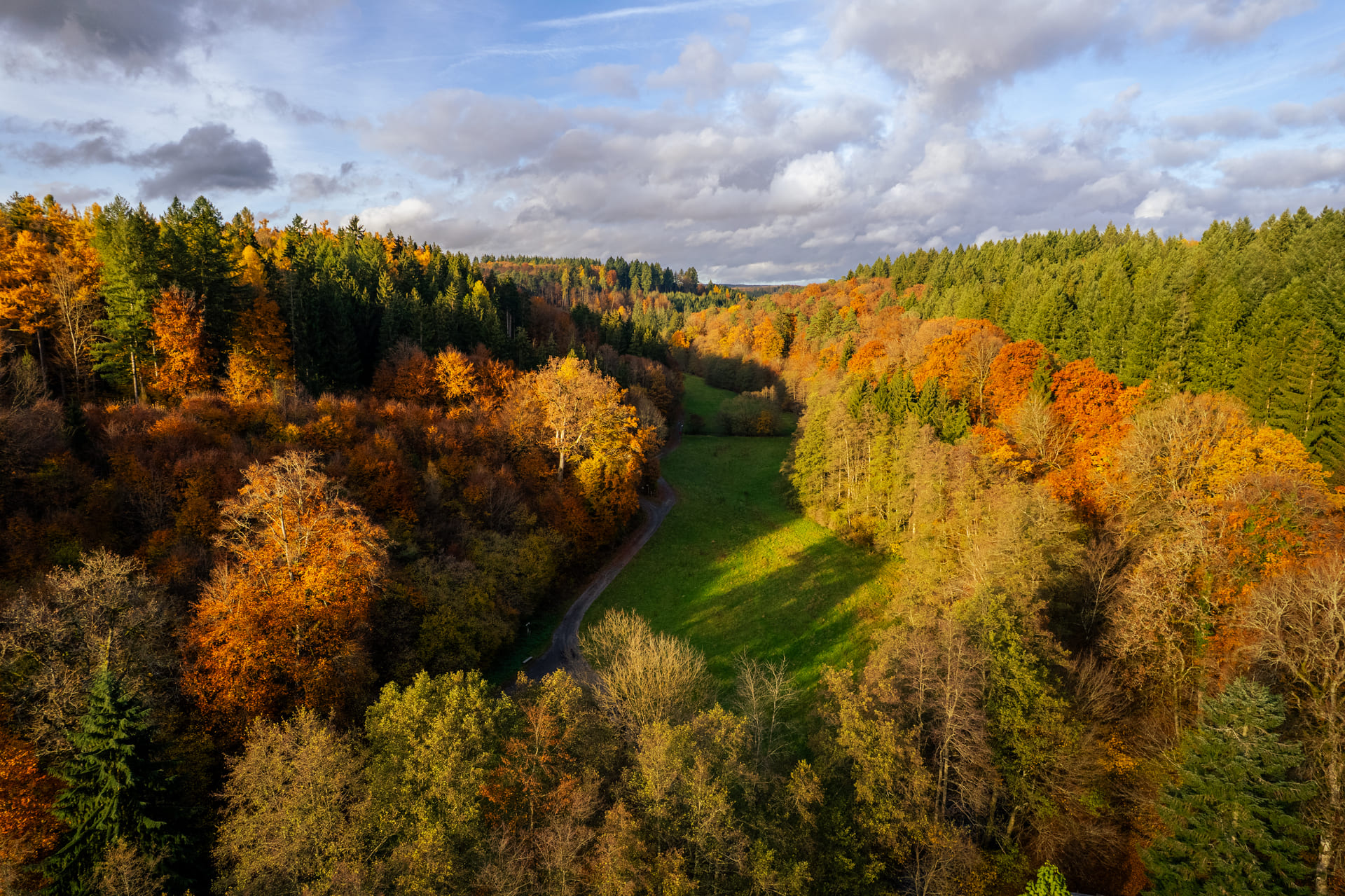 Herbstwald mit Lichtung aus der Drohnenperspektive